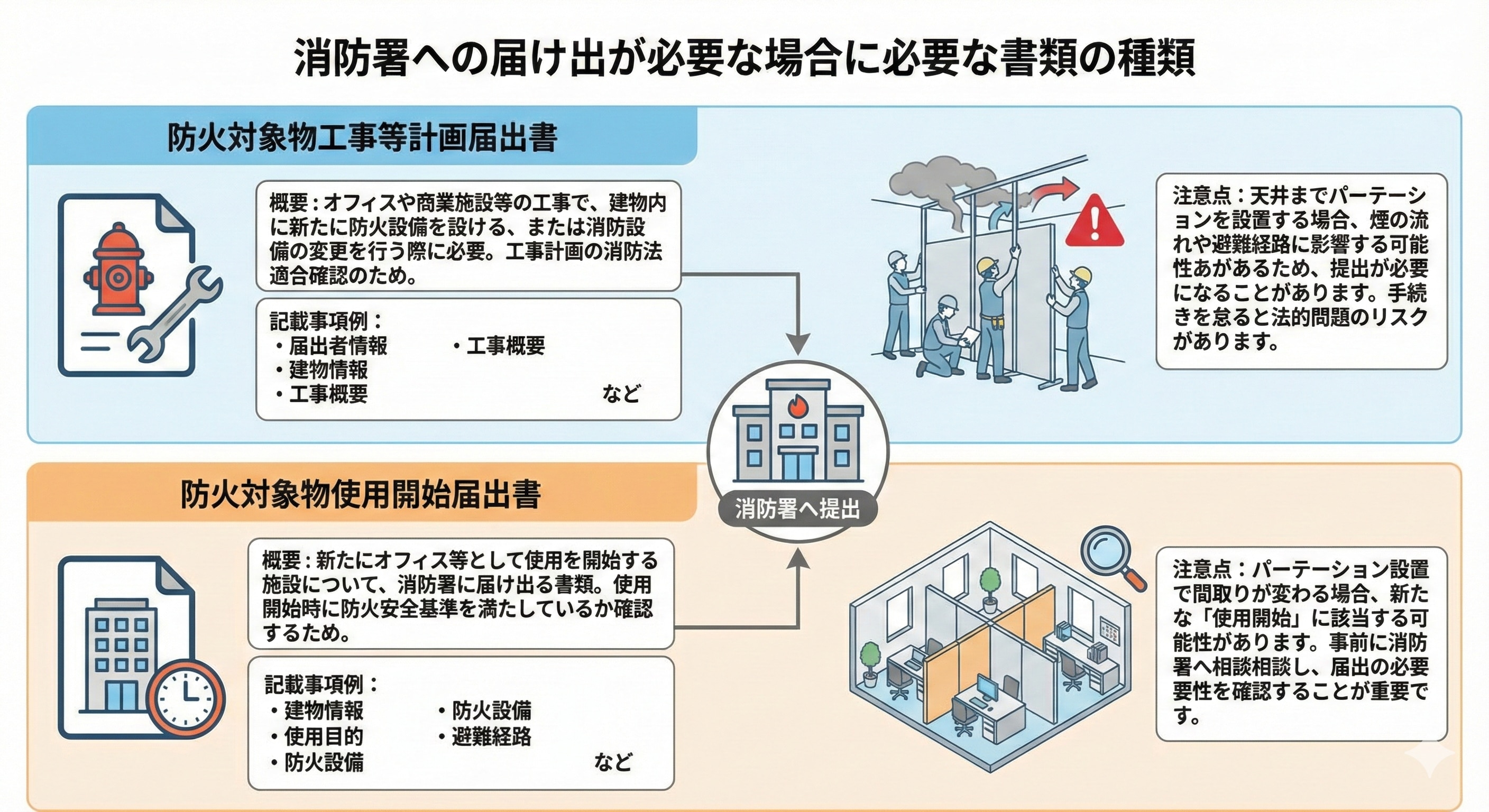 この記事では、パーテーション消防法の重要性や届け出の必要性について解説しました。