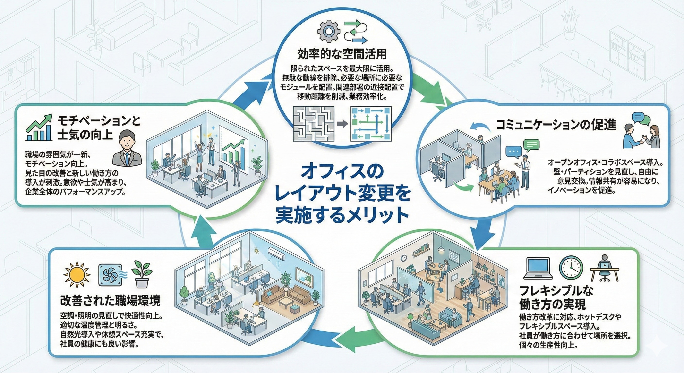 オフィスのレイアウト変更は、明確な目的設定と現状把握、専門家の協力、柔軟性の確保、従業員の巻き込み、そしてフォローアップの徹底が成功の鍵となります。