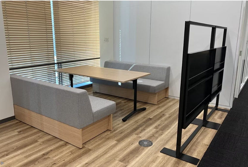 執務スペースと近接しているため、ローパーテーションを設置した事例です。ローパーテーションを設置することで、視線を遮りすぎないため、開放感を損なわずにプライベートな空間を確保できます。