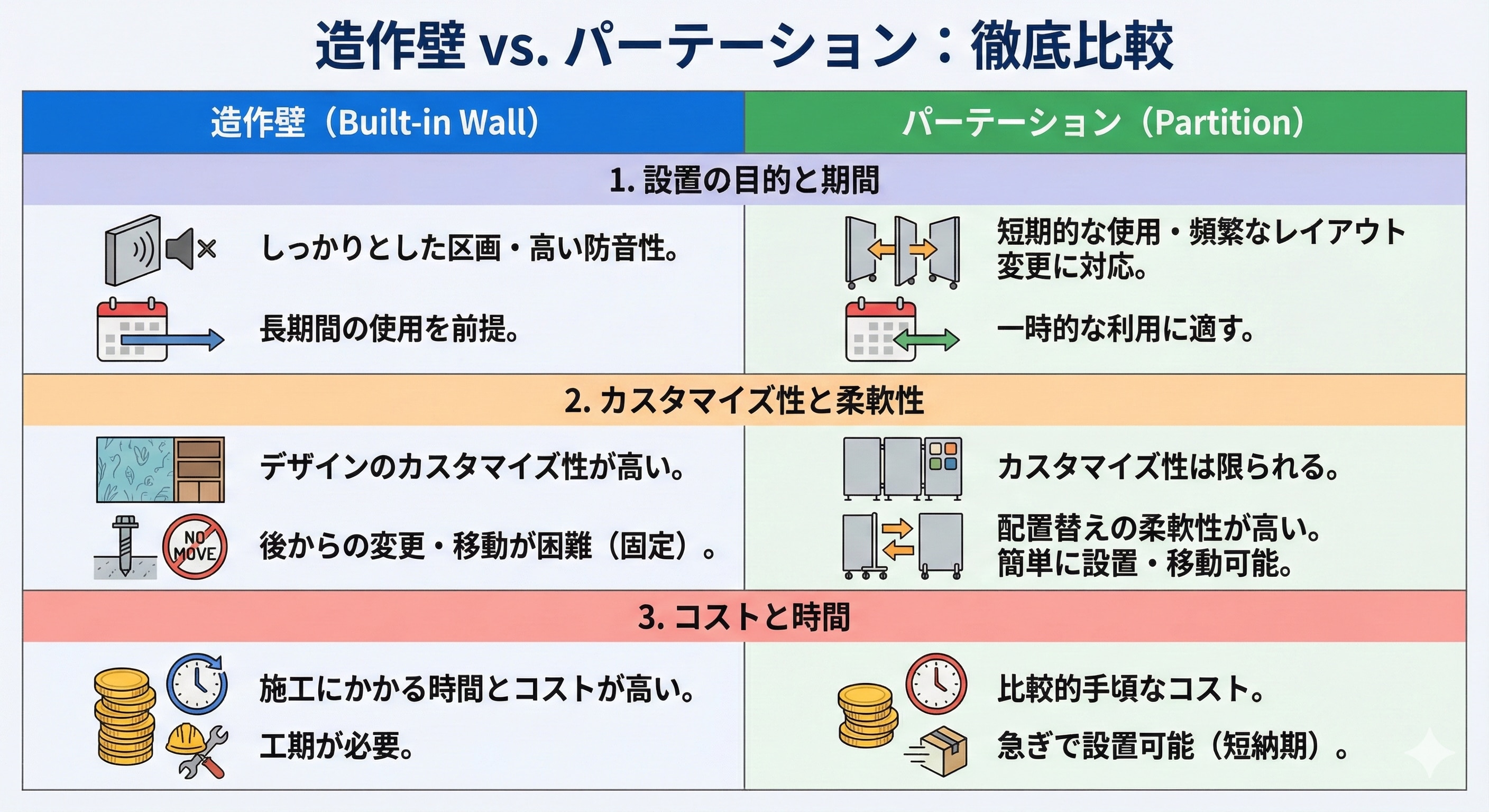 それに対し、パーテーションは短期的な使用や頻繁なレイアウト変更を伴う環境に適しています。
