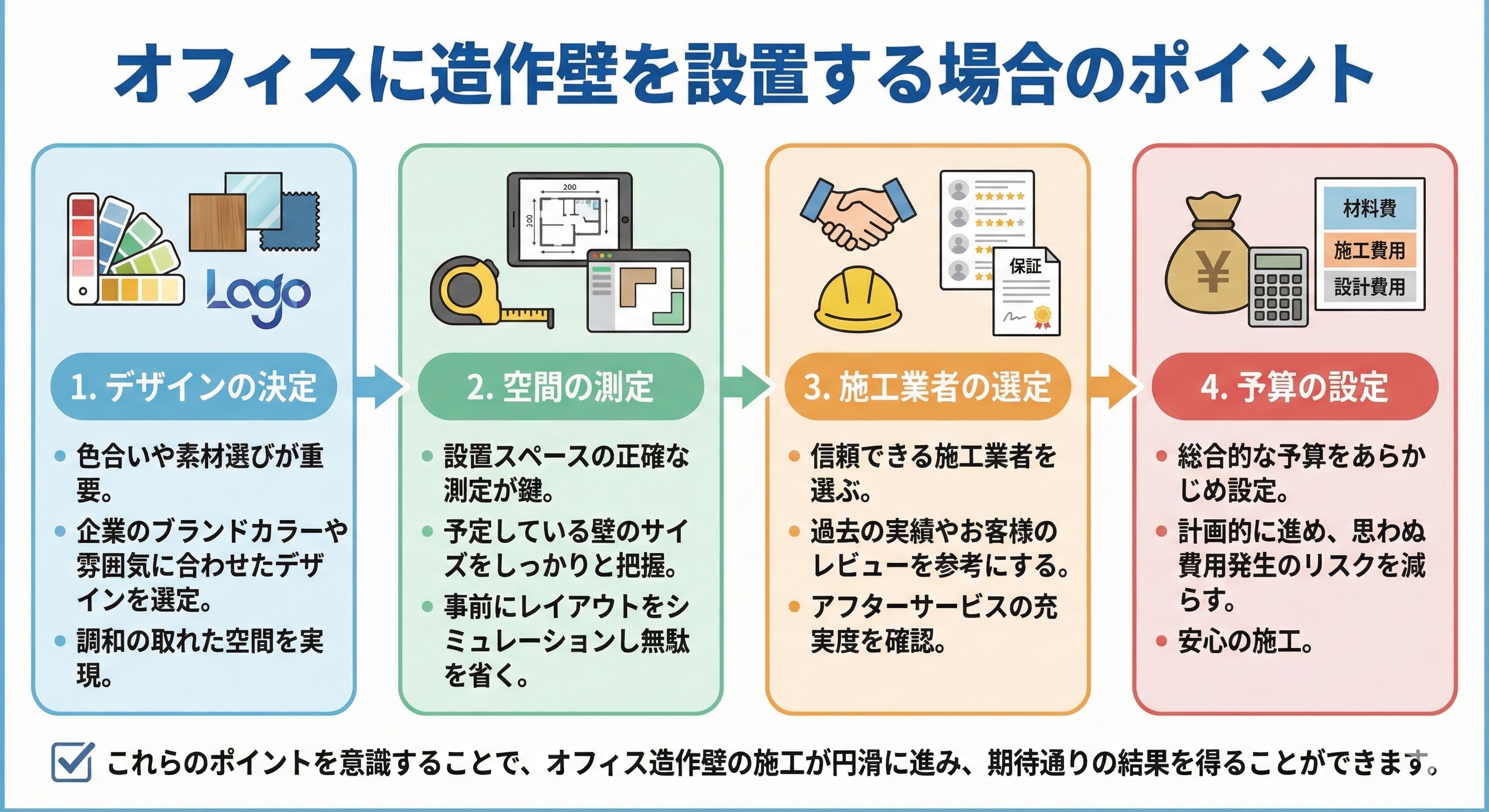 オフィス造作壁を設置する際には、いくつかのポイントを押さえておく必要があります。