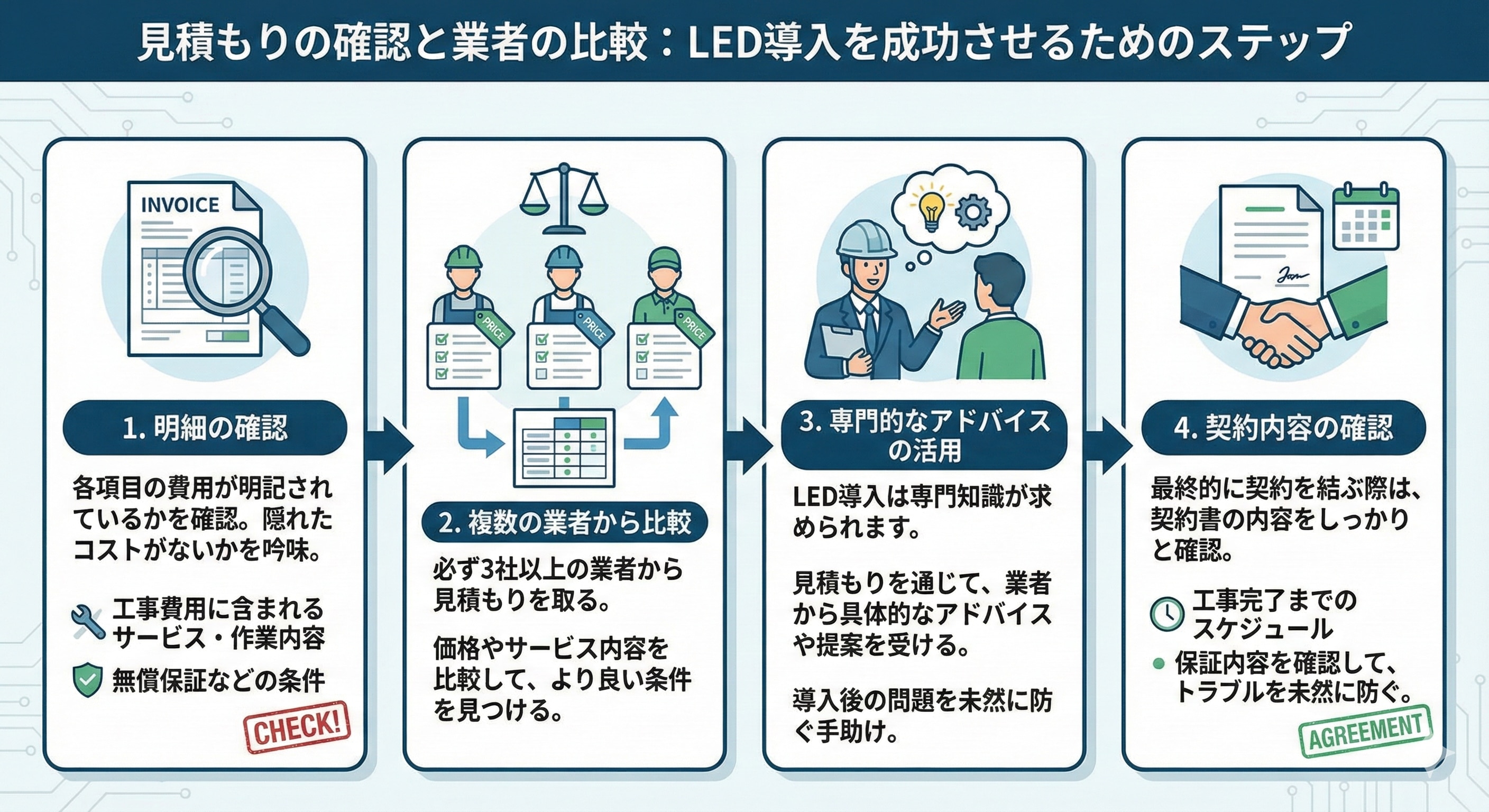 LED化工事を成功させるためには、複数の業者から見積もりを取り寄せることが大切です。