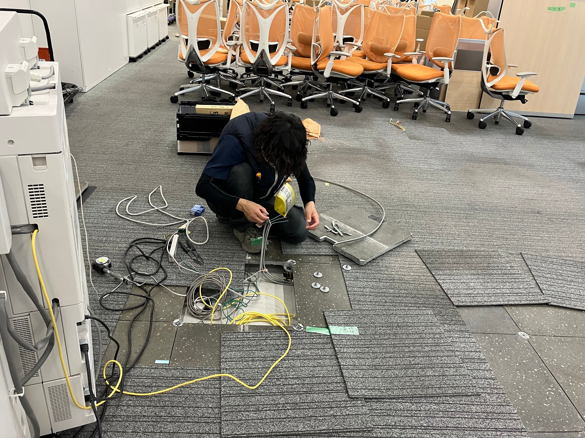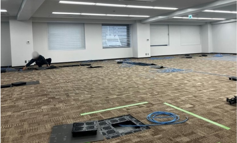 OAフロア(床下)の場合: 床パネルをめくり、配線をデスクの予定位置まで這わせます。天井の場合は、 天井裏を通して、壁やパーテーションの中に配線を落とし込みます。