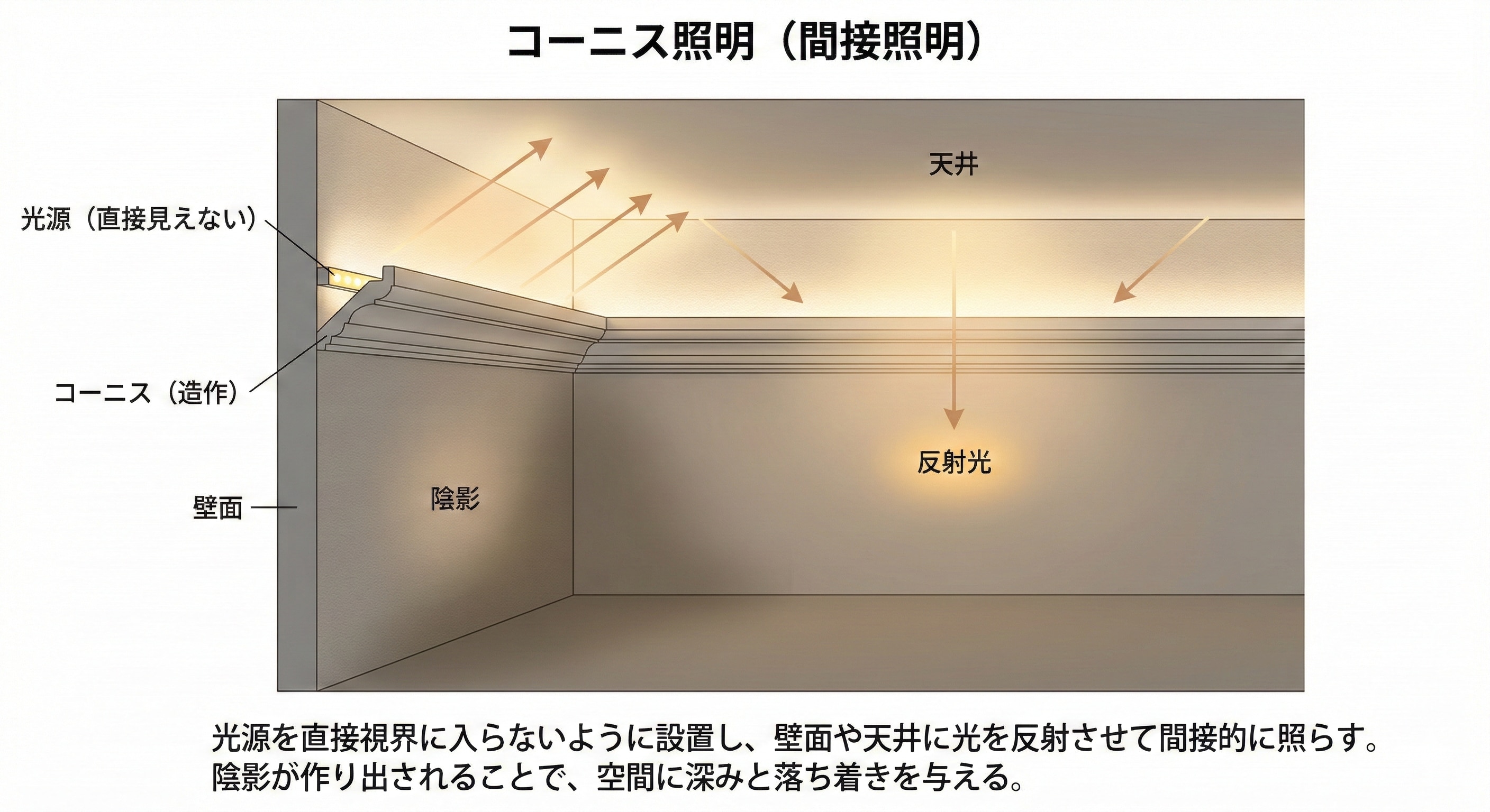 コーニス照明とは、光源を直接視界に入らないように設置し、壁面や天井に光を反射させて間接的に照らす照明方法のことです。陰影が作り出されることで、空間に深みと落ち着きを与えられます。