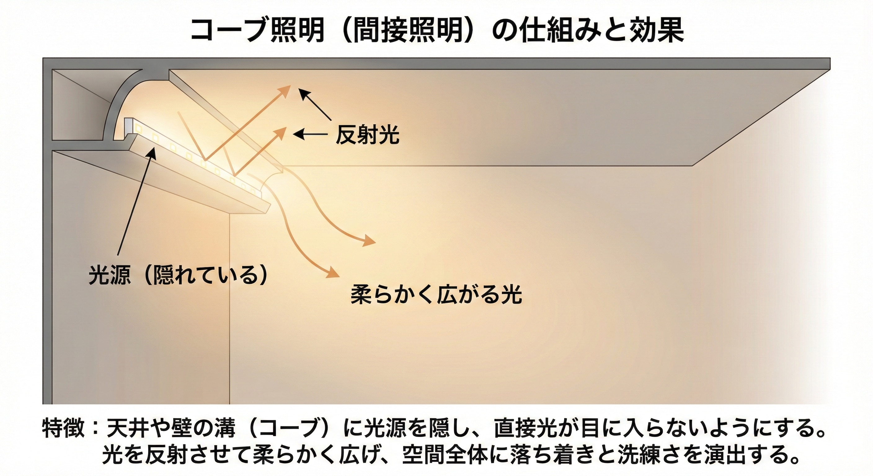 コーブ照明は、天井や壁の溝に間接照明を組み込むことで、光源を直接目に入らないようにした照明技術です。光を反射させて柔らかく広がるため、空間全体に落ち着きと洗練さを演出できます。