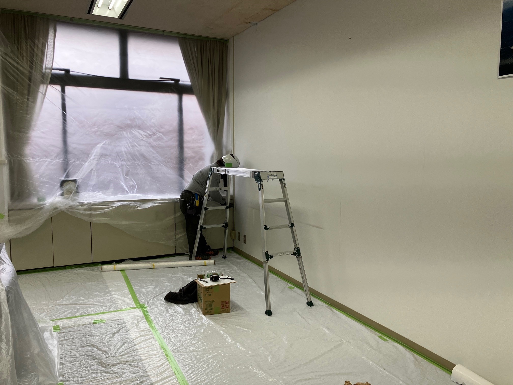 デスクや書庫、OA機器に、粉塵が舞わないようビニールシートを被せます。