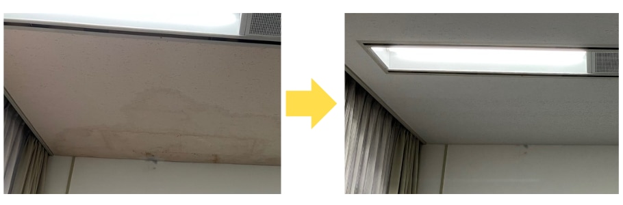 岩綿吸音板に水漏れのシミがありましたが、張替え工事を行ったことで、オフィス本来の清潔感を取り戻し、明るく美しい天井へと蘇りました。