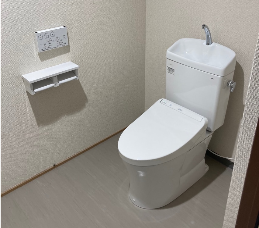 最後に便器や手洗いカウンターなどを設置し、通水テストを行い、完了です。
