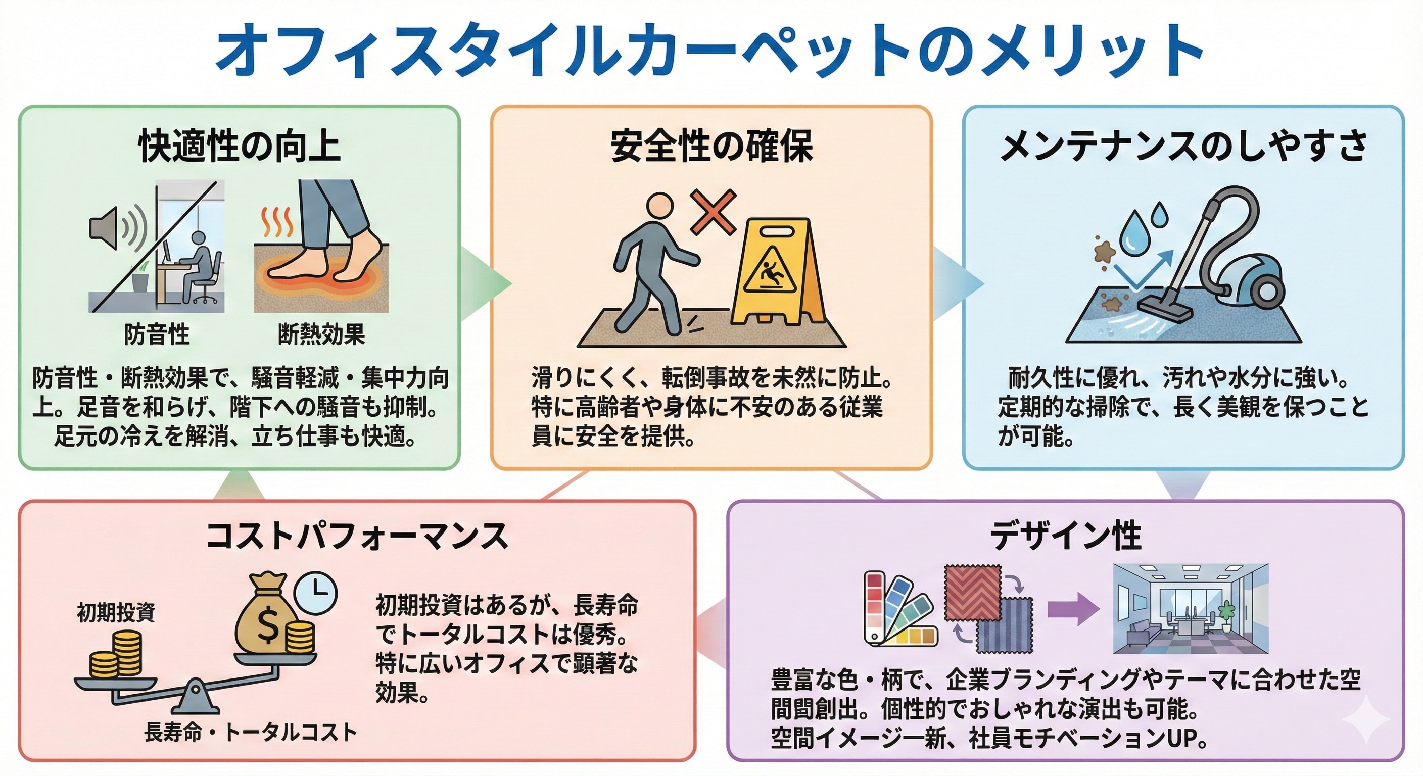 この記事では、オフィスタイルカーペットのメリットや施工方法について詳しく解説しました。