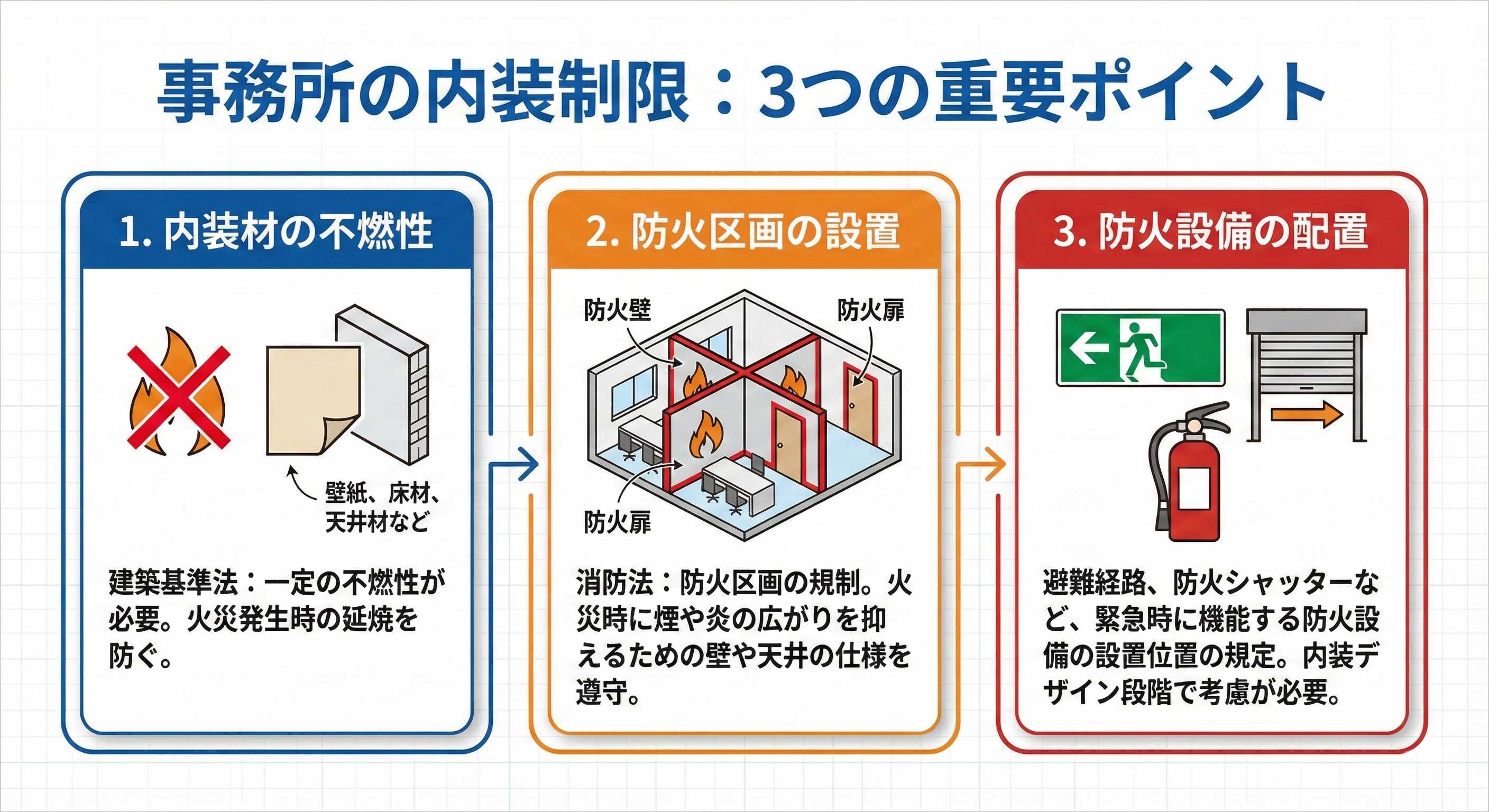オフィスの内装デザインは、建築基準法および消防法の規定を遵守する必要があります。これにより、内装材の使用に関する特定の制限が生じ、特に壁材や床材、天井材、さらに防火性能を持たせたドアやパーティションの使用に厳しい基準が設けられます。