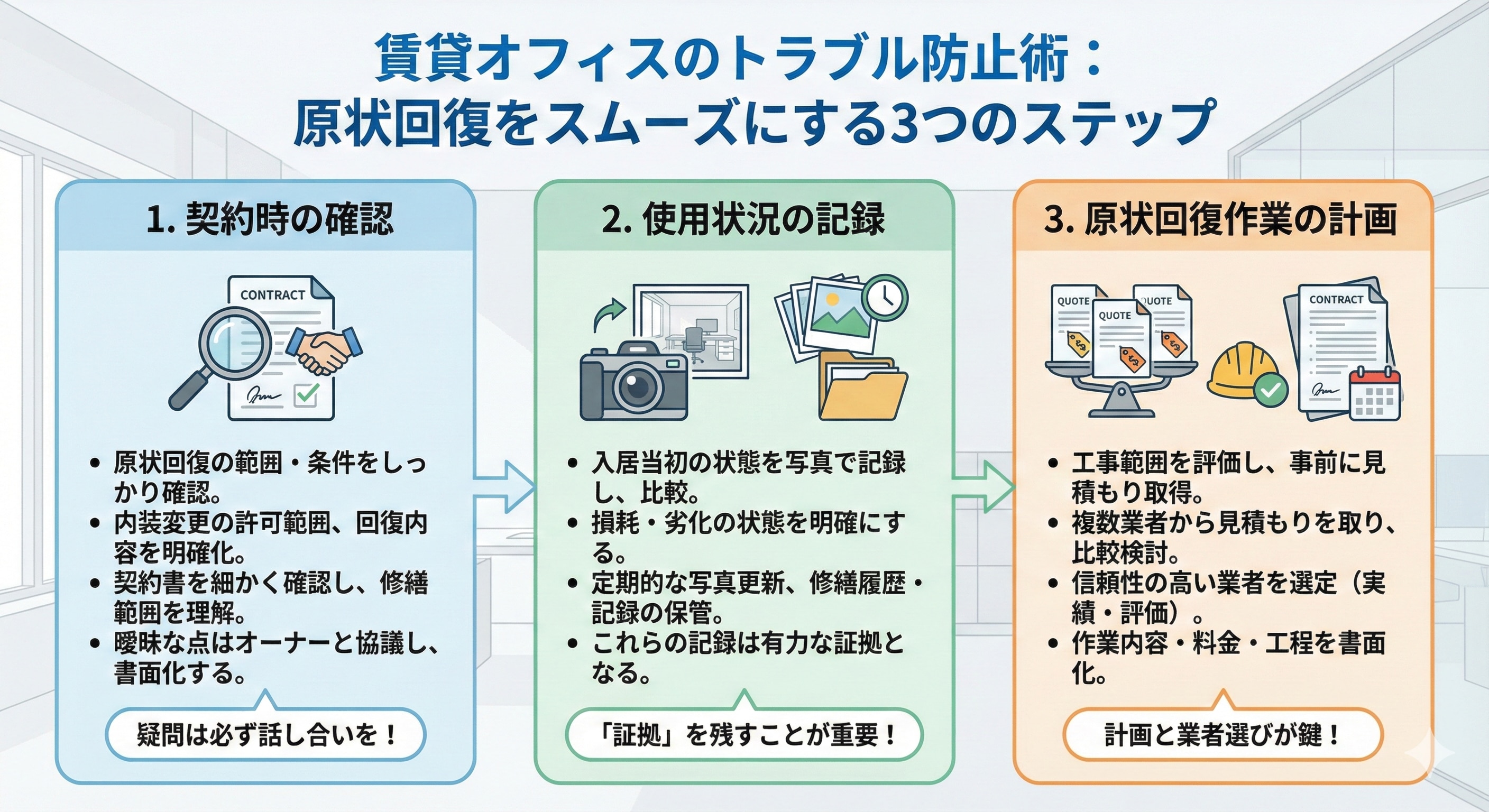 オフィスの原状回復に関するトラブルは、契約内容や確認不足から発生することが多いです。契約時に内容をしっかりと確認し、オフィスの状況を記録することで、トラブルを未然に防ぐことが可能です。また、万が一トラブルが発生した際には、冷静に対応し、必要に応じて専門家に相談することで解決の手助けとなります。
