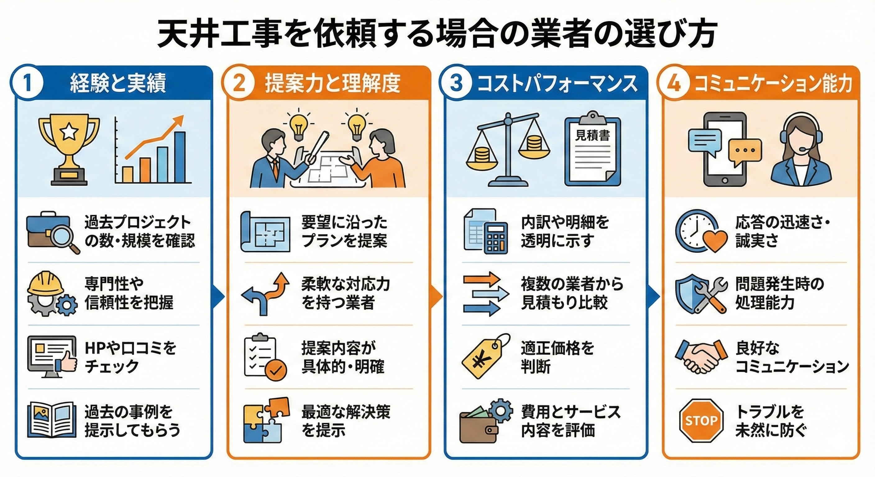 工事が完了したら、最終的に完成した天井の確認を行い、仕様通りに仕上がっているかをチェックします。問題があれば、即座に業者に連絡し、修正を依頼しましょう。