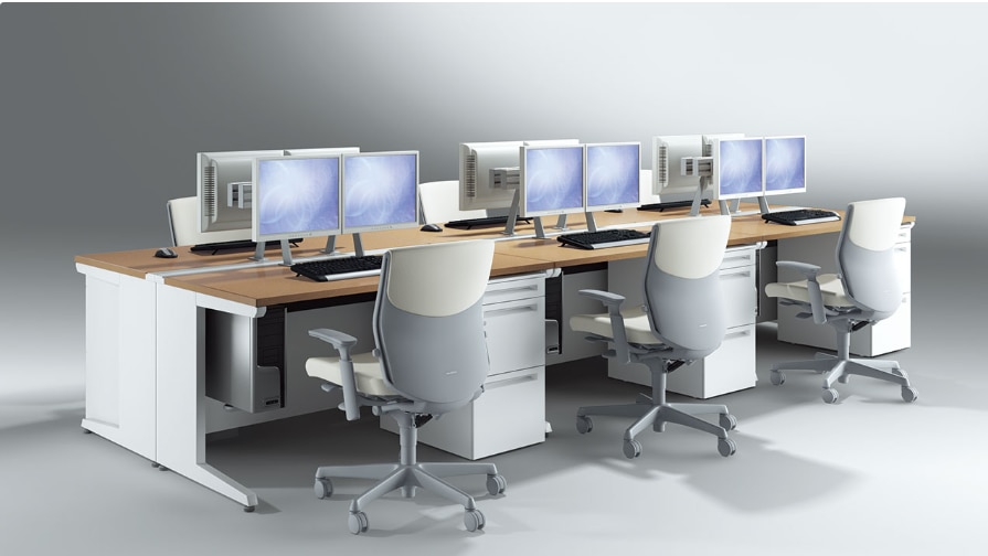 脚がL字型になっており、机を並べてもすっきりとした印象を与えます。 手前に脚がないため、4本脚タイプと比べ足の引っ掛かりが少なく、移動時や作業時のストレスが少ないのが特徴です。 詳細はこちら:Pro Unit/オカムラ