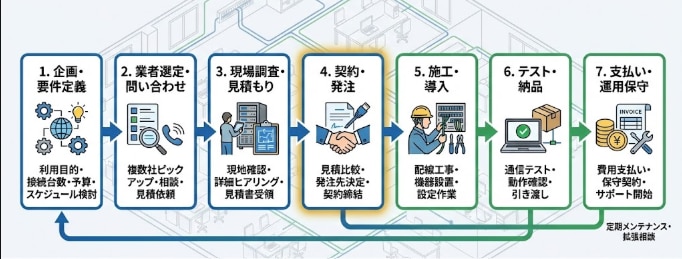 施工中は、電源やネットワークが一時的に使用できなくなることがあるため、それに伴う業務の影響を最小限に抑えるよう事前準備が必要です。また、工事完了後も配線の配置が適切であるか、機器が正常に設置されているかを確認し、万が一のトラブルに備え、業者と綿密に連絡を取り、問題が発生した場合には迅速に対応してもらいましょう。
