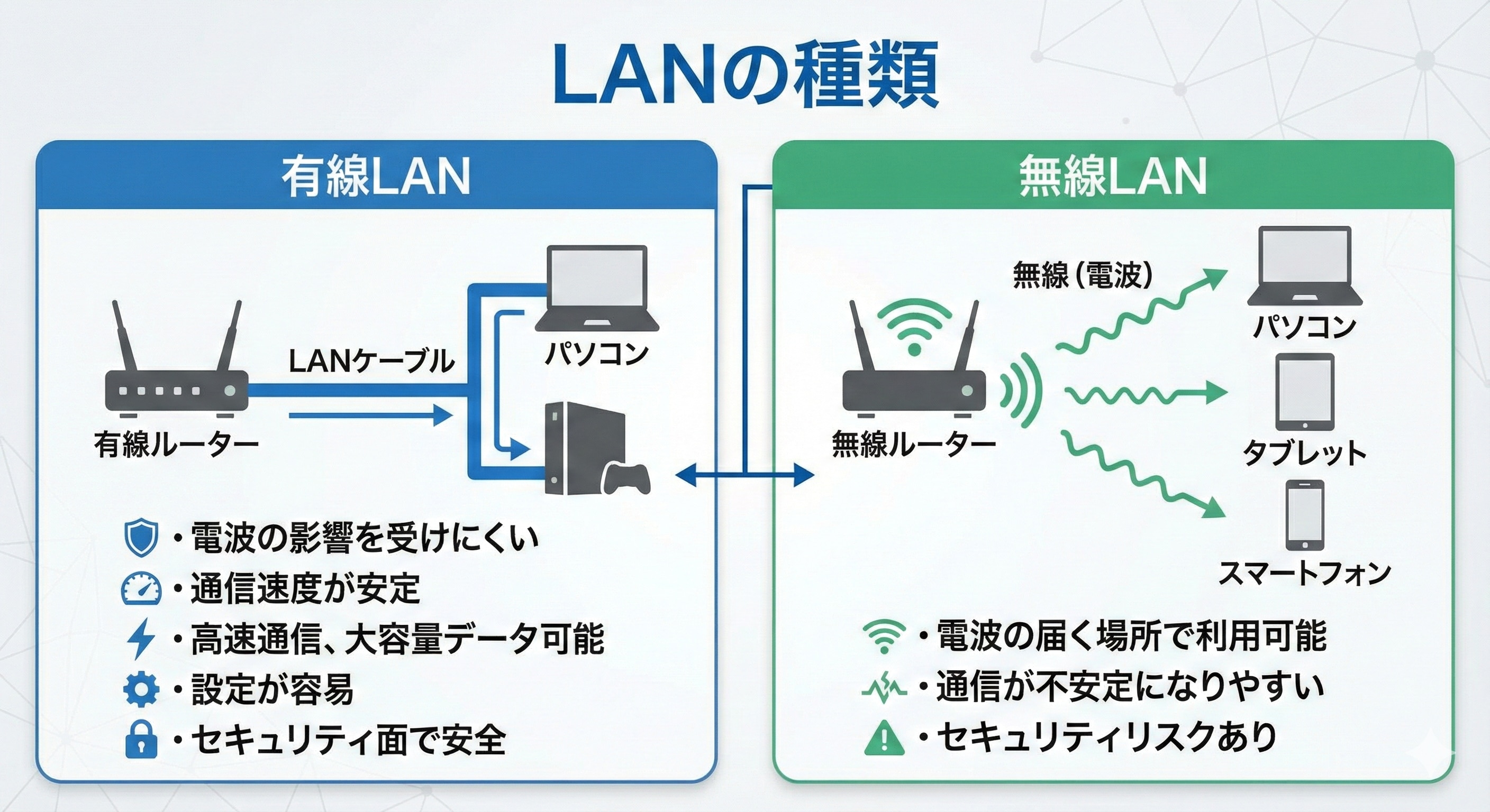 ケーブルの代わりに無線(電波)を使って通信を行うのが無線LANです。 LANケーブルを使用しないため、電波の届く場所であればどこでもネットワークを利用できます。 しかし、有線と比べ、通信が不安定になりやすい点やセキュリティリスクがあるため、注意が必要です。