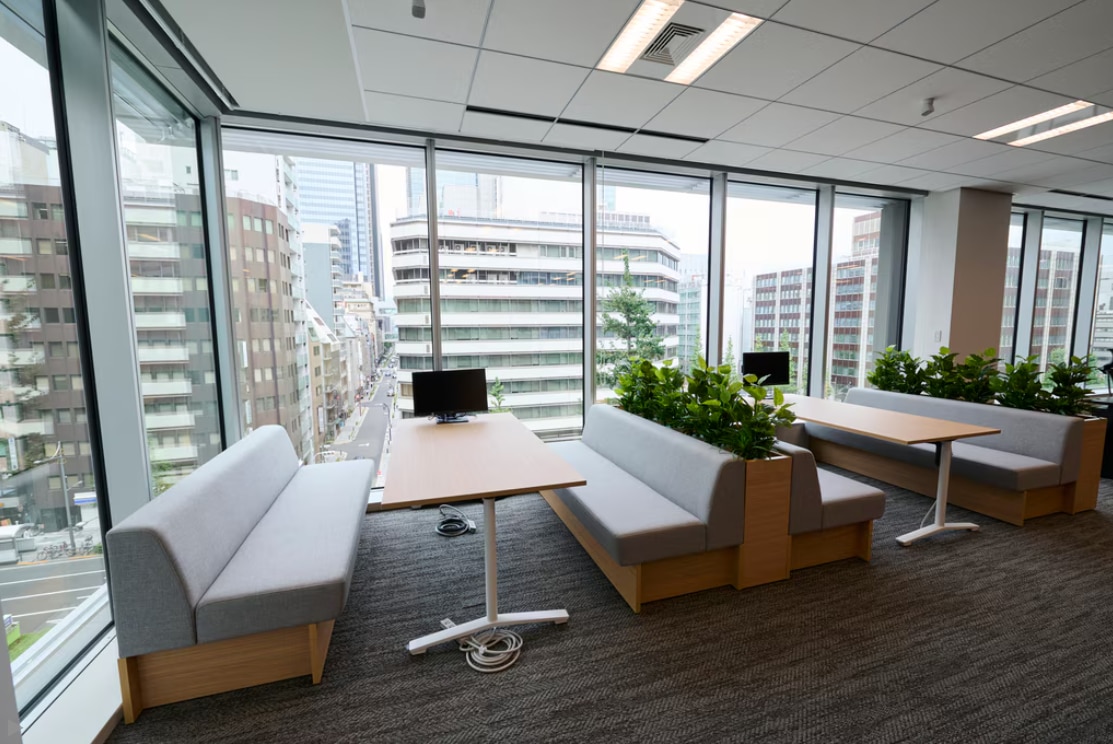ファミレス席は狭い空間やデッドスペースにも設置できるため、限られたオフィス空間を有効活用できます。会議室や応接室などの別室を用意するには広い面積が必要ですが、ファミレス席は空きスペースに設置できるため導入しやすいでしょう。 空き空間に合わせてソファの設置をアレンジできるのもメリットです。向かい合わせのソファで4人席、コの字形ソファで6人席など柔軟に設置できます。