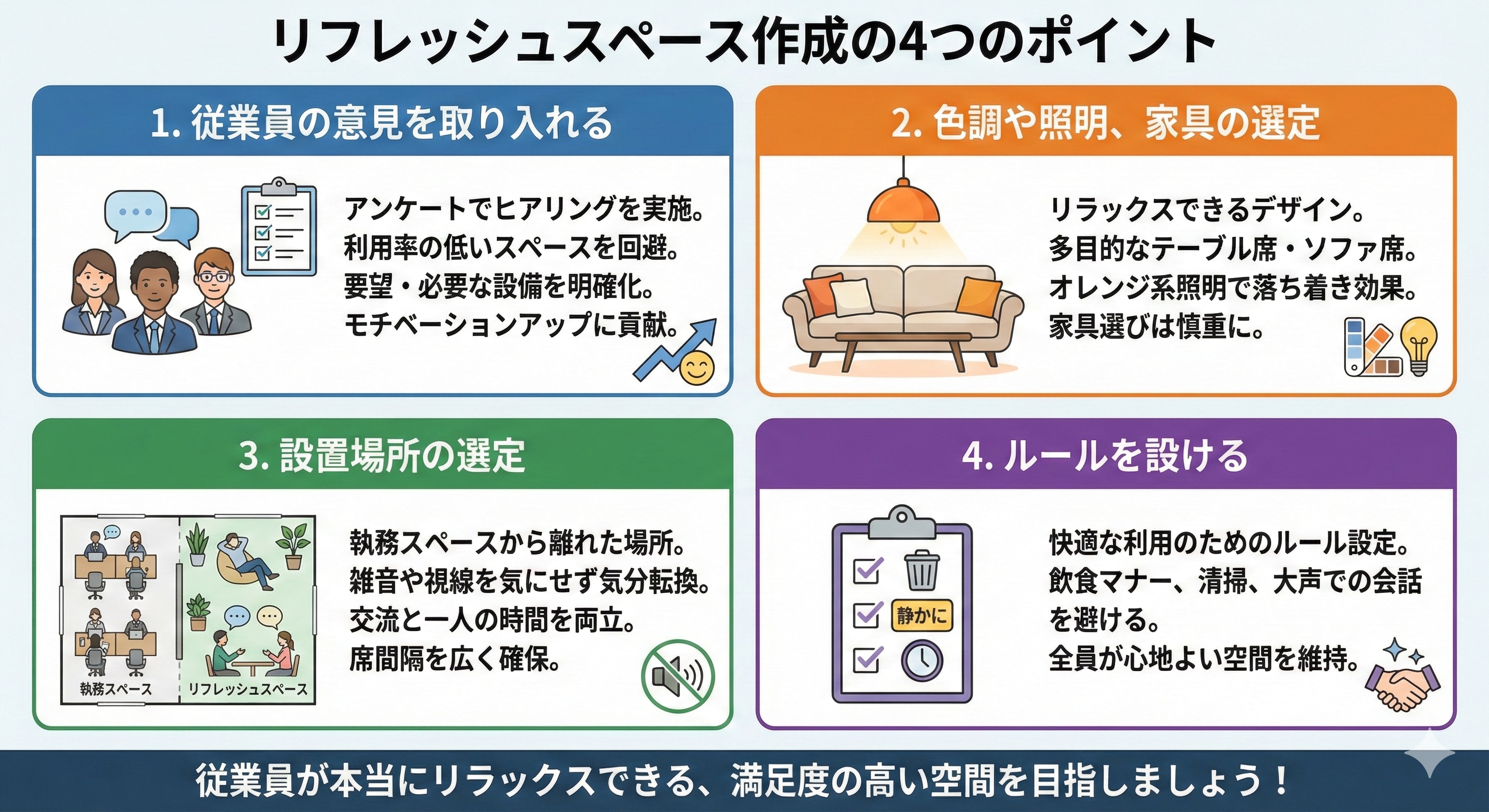 - ・リフレッシュスペースをつくる場合に気を付けたいポイント