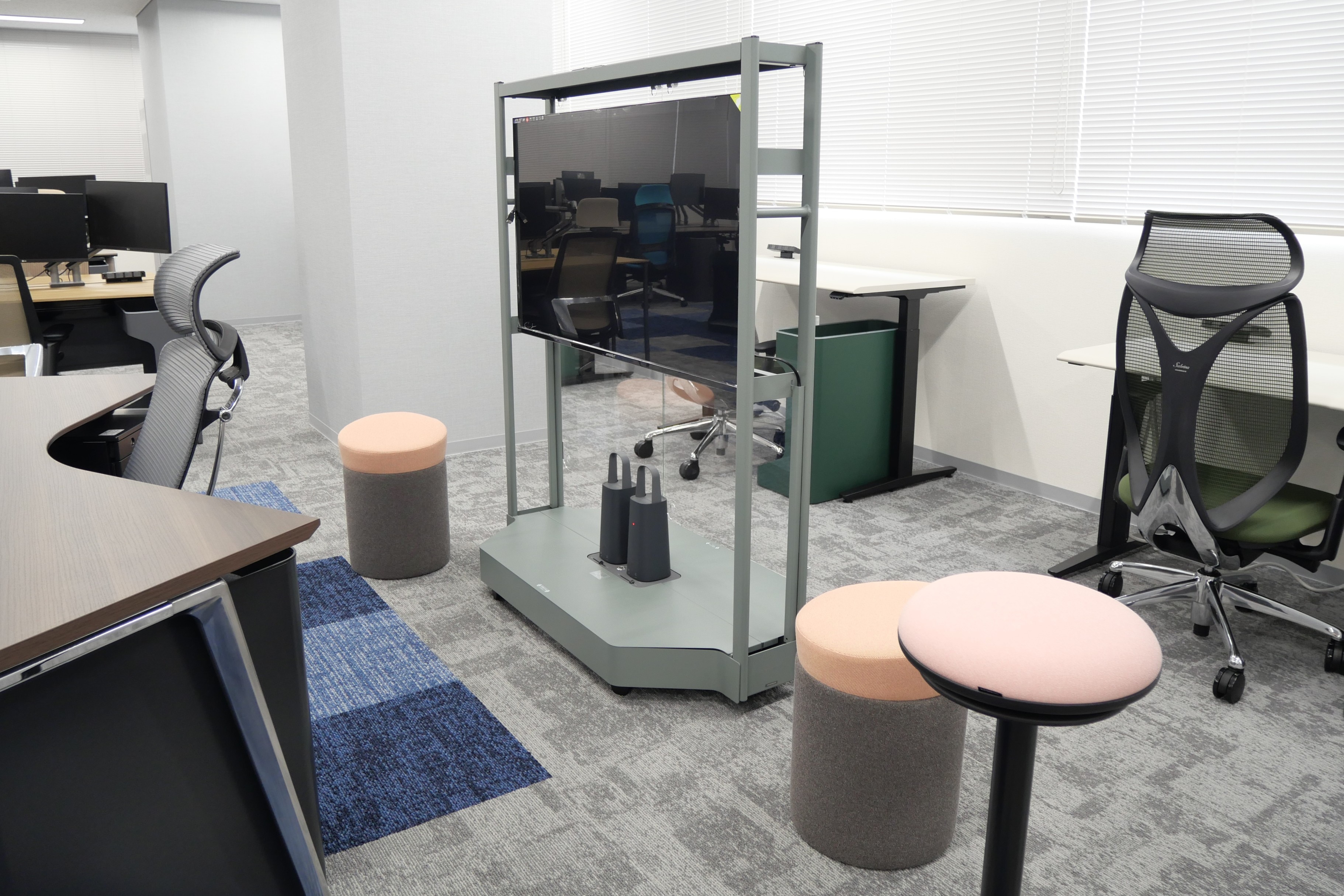 モニターのそばに軽く腰掛けるチェアを配置し、気軽に打合せできるスペースを実現